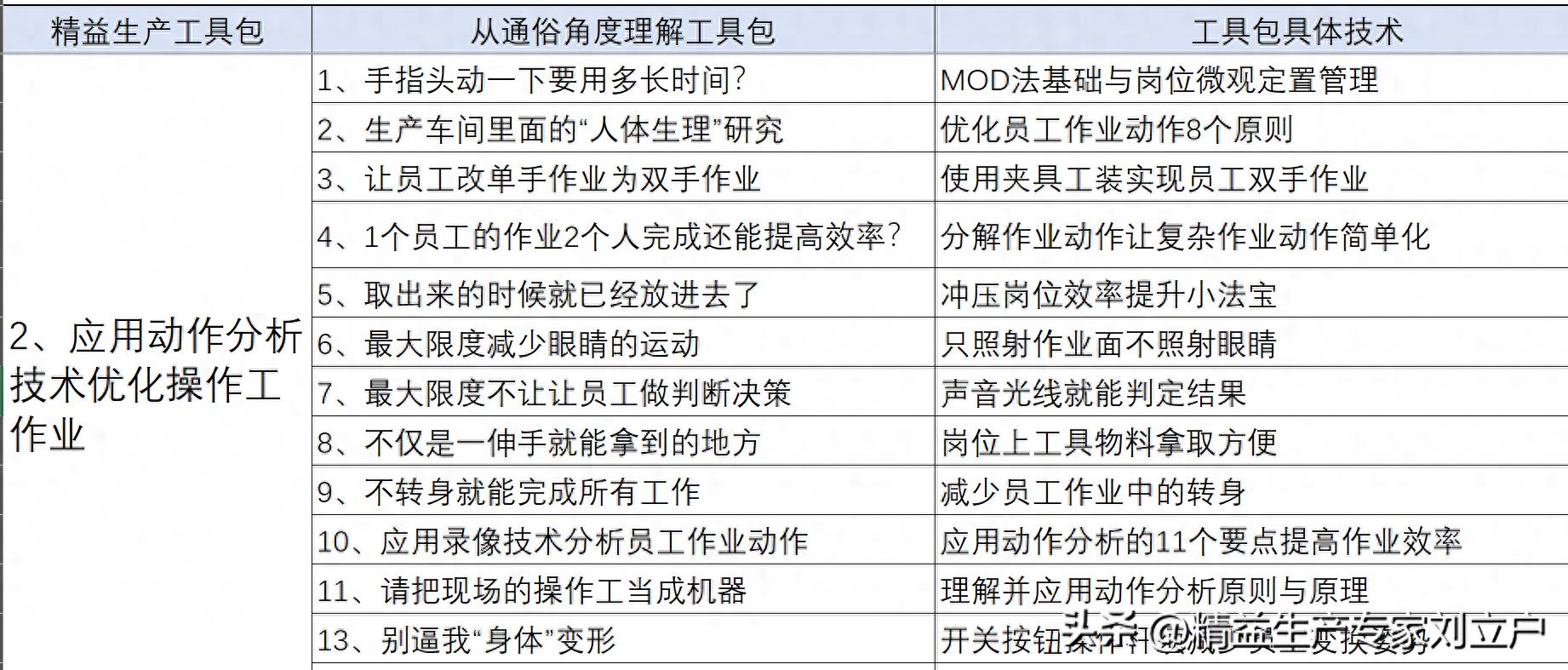 实际应用中,我总结了下面的13个动作分析工具包,现在分享给大家。注意,第二列是通俗说法的表达,第三列是专业技术方法的陈述。