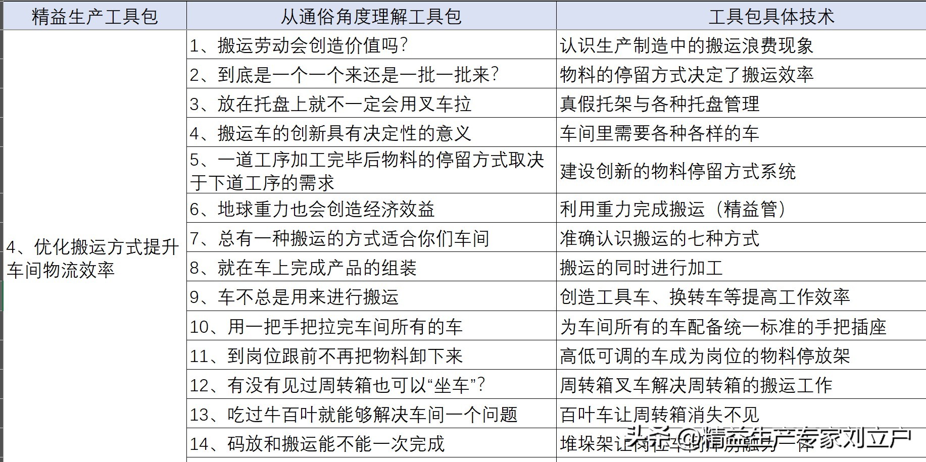 根据以上的理论模型,生产现场物流停留方式的改进与物流效率的提升工具包,在刘立户老师多年的实践中逐渐形成了,现在分享给大家: