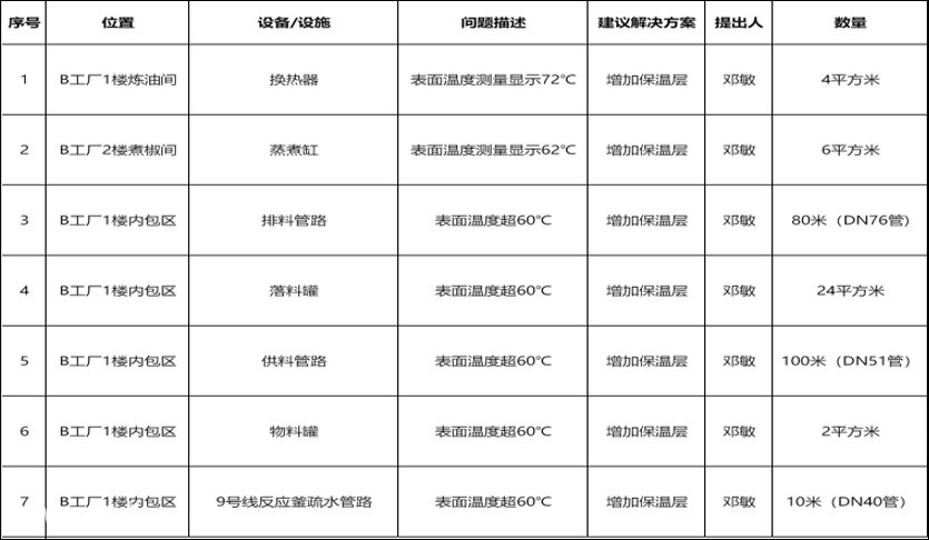 1、实践咨询服务中发现,很多公司加热型设备外表没有保温层,这些设备包括热解换设备、各类反应釜、各类规格型号硫化罐、蒸煮釜、油炸机外壳、鸡鸭屠宰烫毛机、热水罐、蒸汽管道等,更包括散热量更大的炼钢加热炉、钢水铁水包等等。这些设备表面的保温层严重失效,不论是制造时保温效果不良还是使用过程中严重腐烂损坏,最终的结果就是造成热量大量散失,给企业造成巨大的能源损耗。如下图是某食品公司简单统计结果的一部分,就可知散热量之巨大: